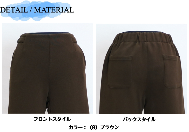 ●2枚の布を1枚の生地に加工したボンディング素材。軽くてシワになりにくく、またハリ感があるため身体のラインが出ることなくすっきり穿けるのが特徴です。