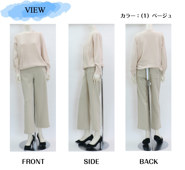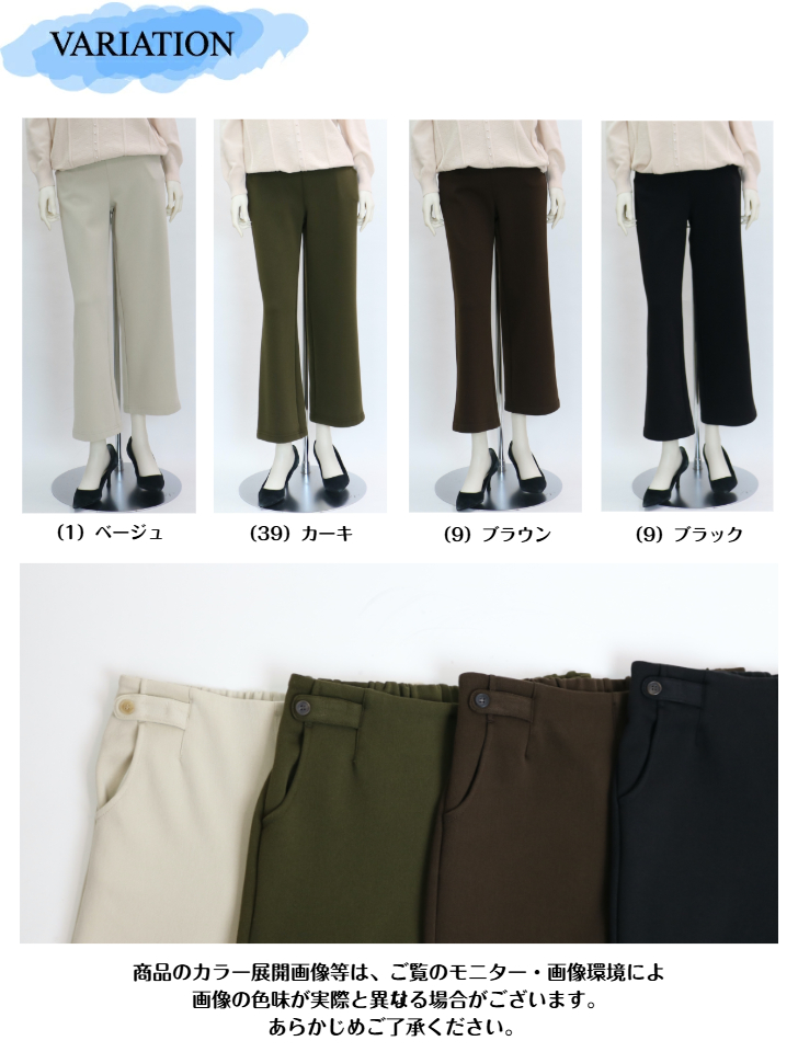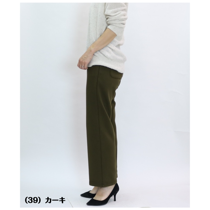 ●裾幅24cmのすっきりワイドシルエットで上品に見せ、ストレッチが効き快適な履き心地も両立。