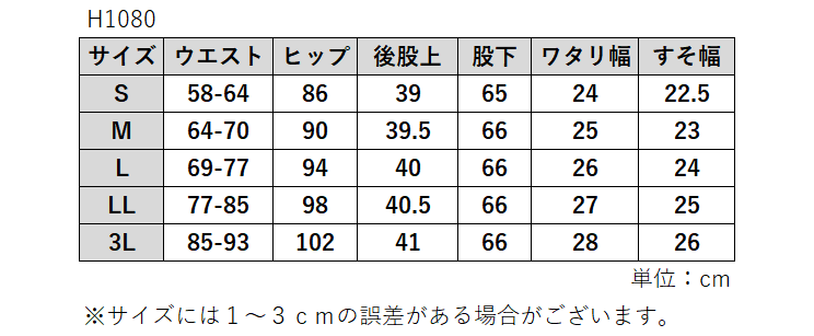 | デザイン | ウエスト総ゴム 前後ポケット付き 股下65-66cm |