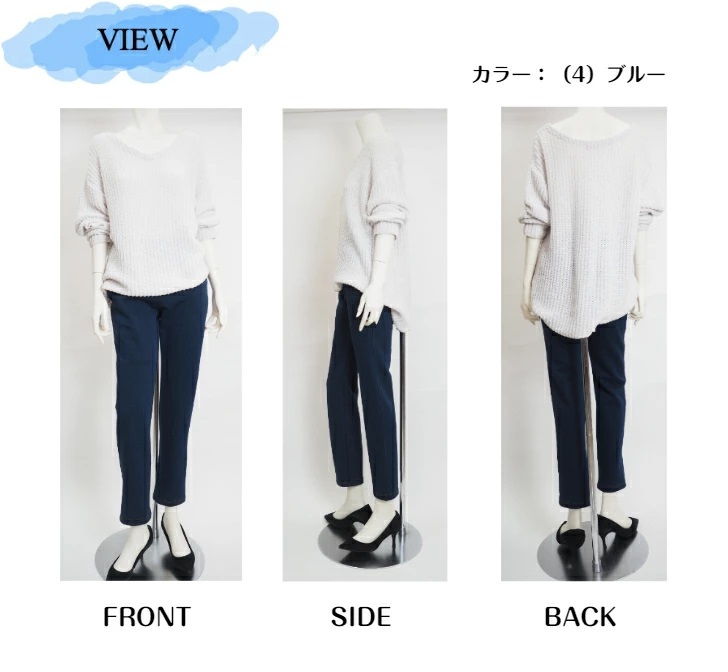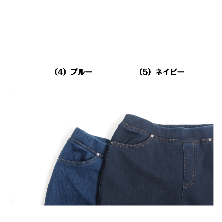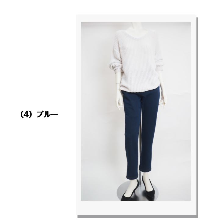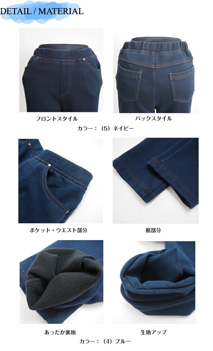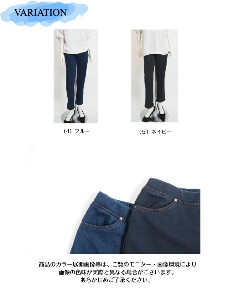 ●表地は風合いのいいデニム調の生地、裏地はソフトフリース生地のスリムパンツです