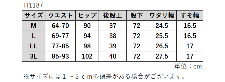 | デザイン | ウエスト板ゴム 前後ポケット付き 股下72cm |