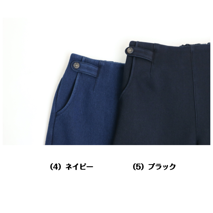 ●2枚の布を1枚の生地に特殊加工したボンディング素材。軽くてシワになりにくく、またハリ感があるため身体のラインが出ることなくすっきり穿けるのが特徴です。