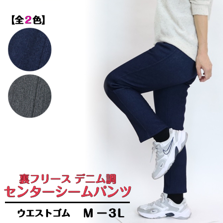 8433 デニム見えで快適、冬の新定番パンツ! 裏フリースデニム調センターシームパンツ M-3L
