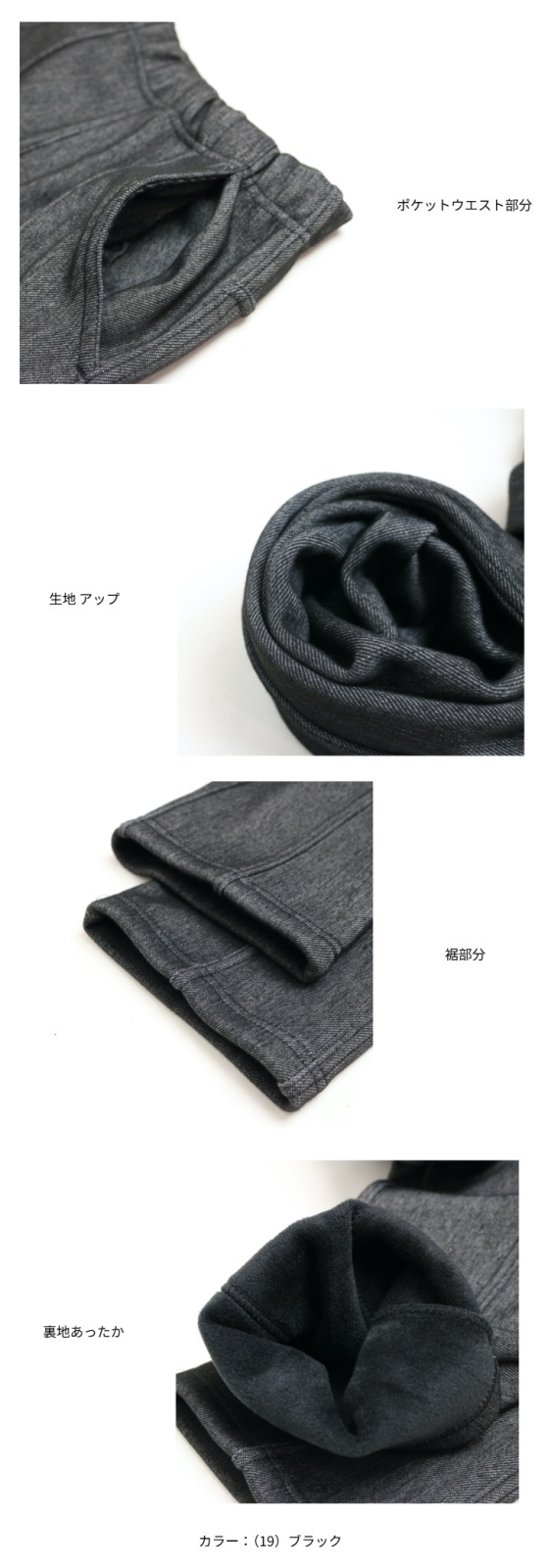 ●デニム調の表情ながら、内側は柔らかな裏フリース素材。しっかり保温してくれるので冬場も暖かく快適です。
