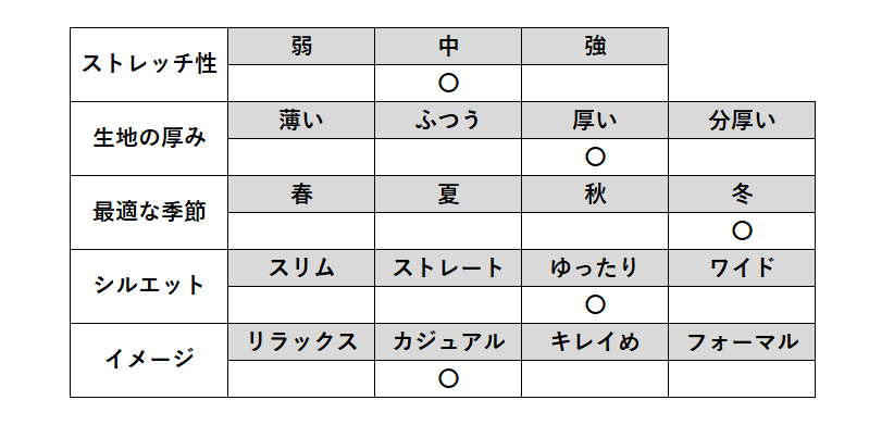 素材 | 表側:ポリエステル95% ポリウレタン5% 裏側:ポリエステル95% ポリウレタン5% |