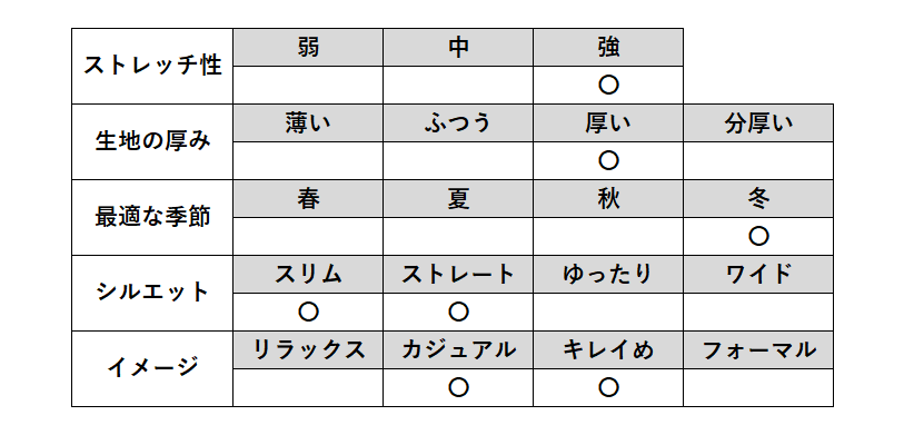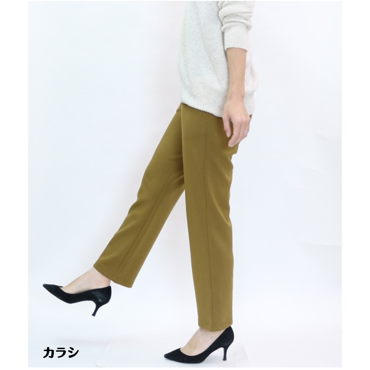 ●脚をまっすぐ見せるスリムストレートシルエット。細すぎず程よいストレートラインで、美脚見えと動きやすさを両立。