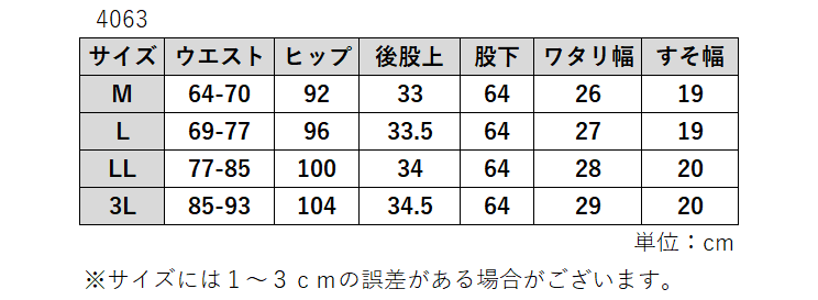 | デザイン | ウエスト総ゴム 前側両サイドポケットあり 股下64cm |