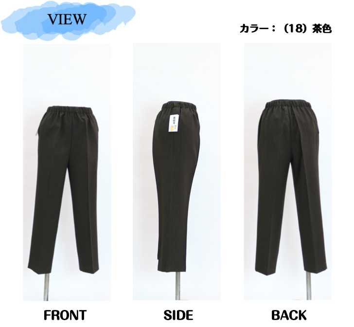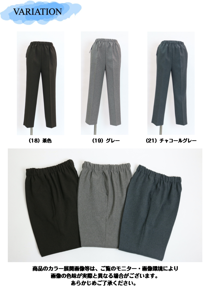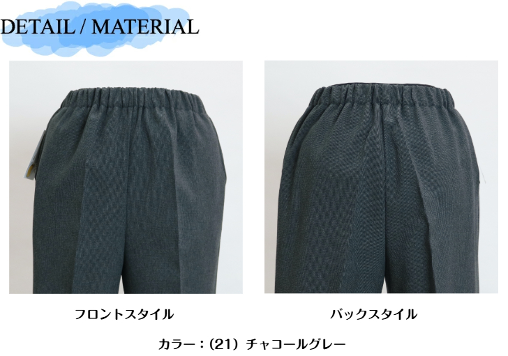| デザイン | ウエスト総ゴム(ゴム取替口付き) 前ポケット付き 股下60-61.5cm |