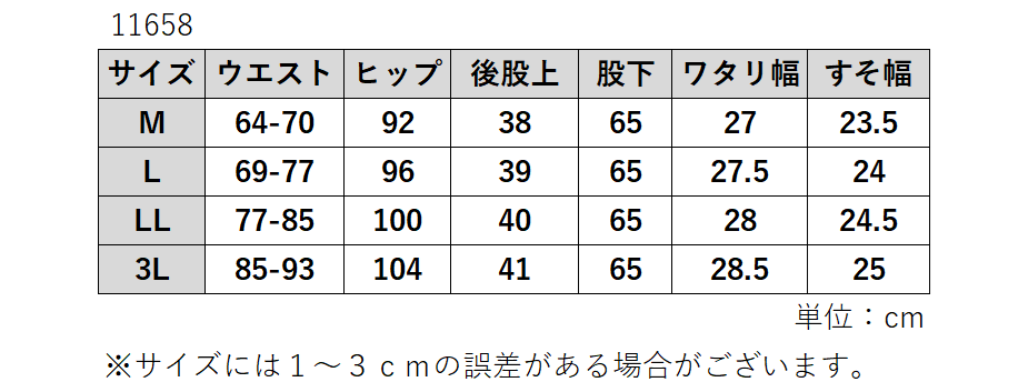 | デザイン | ウエスト総ゴム 前側両サイドポケット付き(後ろフェイクポケット) 股下65cm |