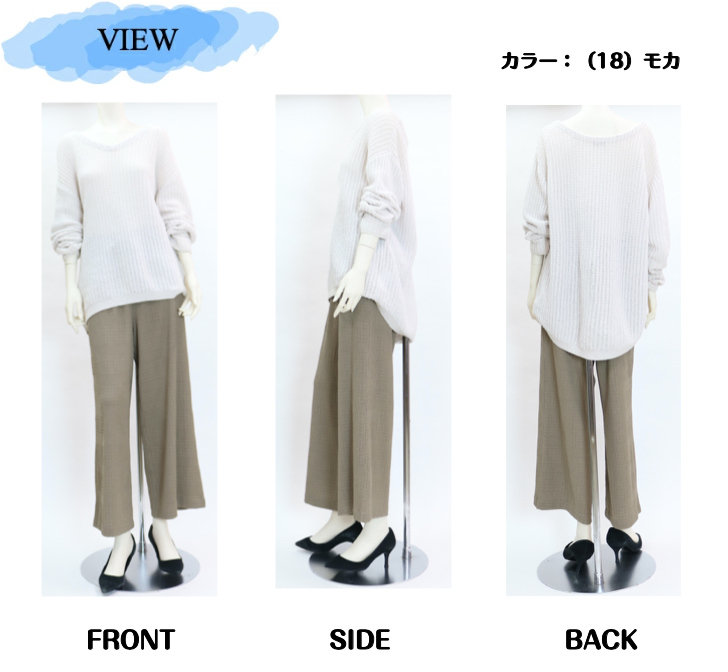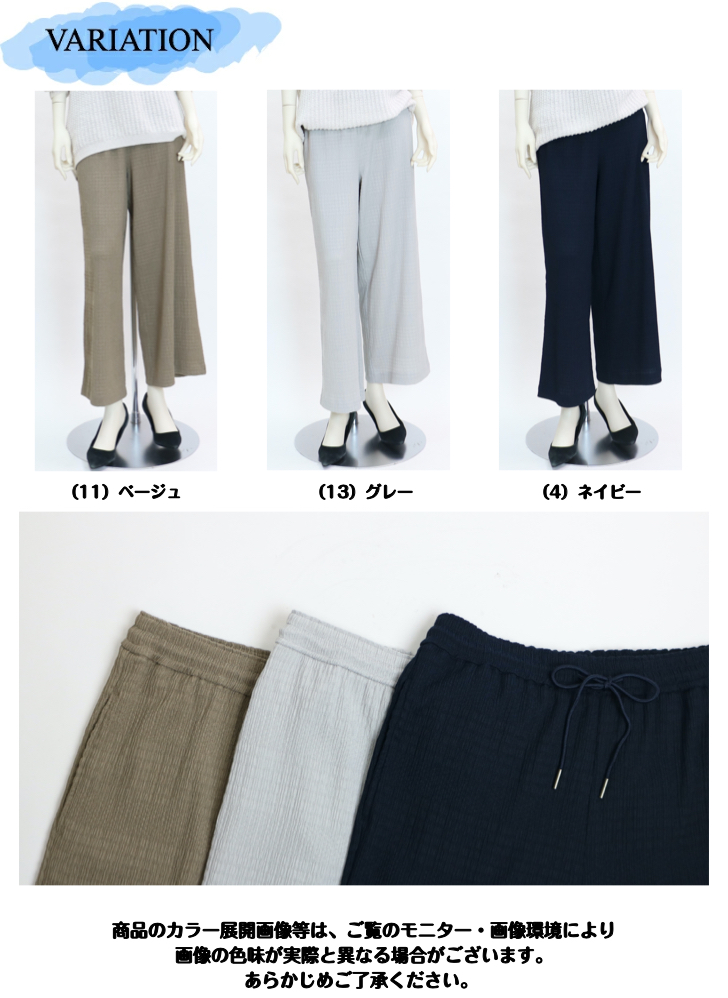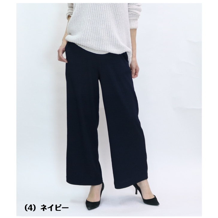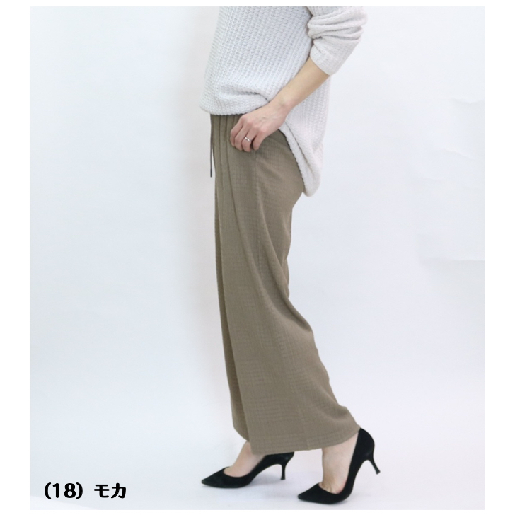 ●落ち感のある素材で大人見え。柔らかく落ち感のある生地が縦ラインを強調し、ワイドでもすっきりとした印象に仕上がります。