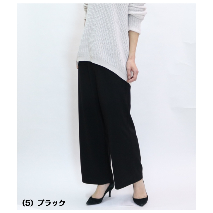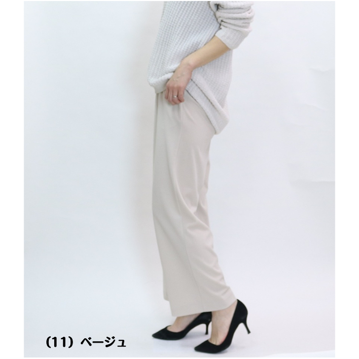 ●裾幅27cmのワイドシルエットで体型カバー。脚のラインを拾わず、落ち感のあるシルエットが縦ラインを強調し、すっきりとした印象に。