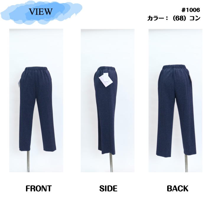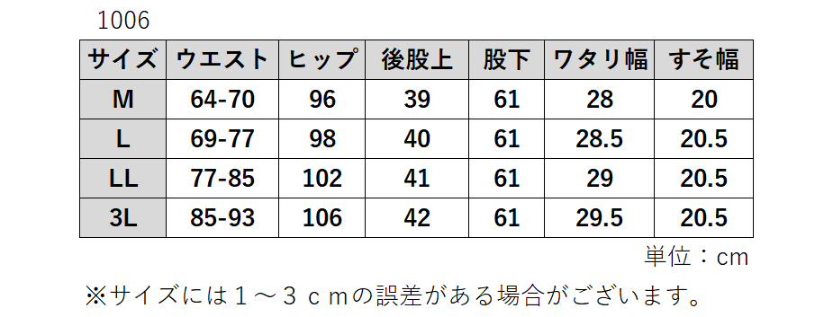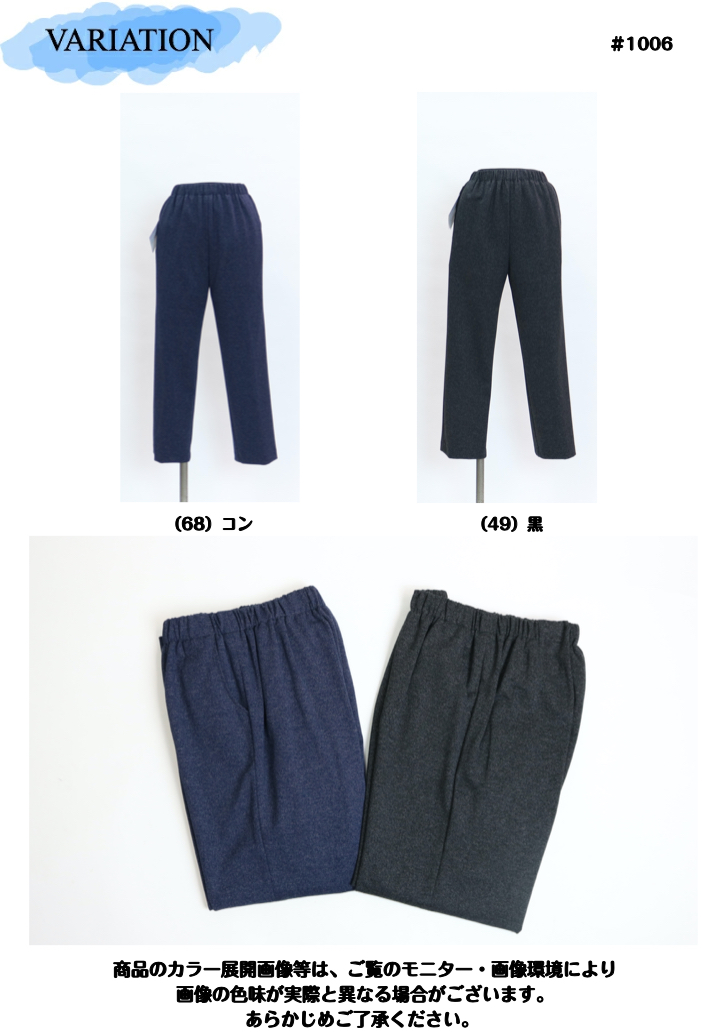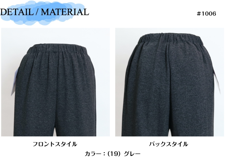 | デザイン | ウエスト総ゴム(ゴム取替口付き) 前両サイドポケットあり 股下61cm |