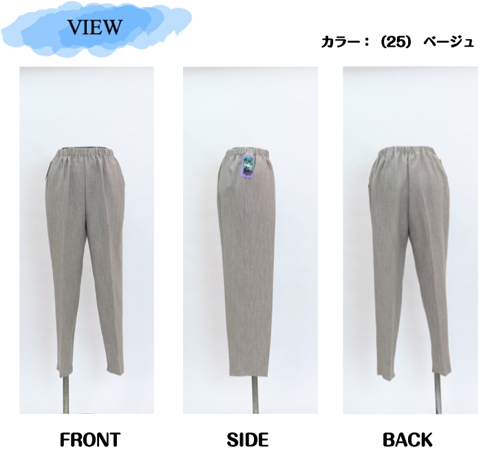 | デザイン | ウエスト総ゴム(ゴム取替口付き) 前ポケット付き 股下65cm |