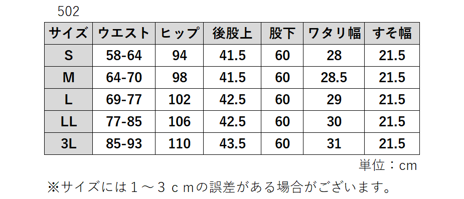 | デザイン | ウエスト総ゴム(ゴム取替口付き) 前ポケット付き 股下60cm |