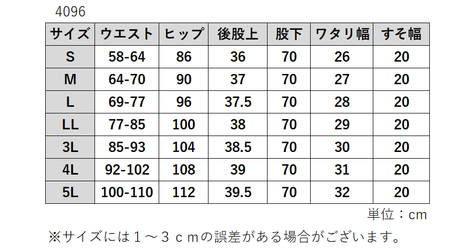 | サイズ | S M L LL 3L 4L 5L |