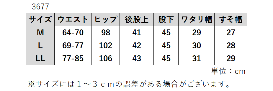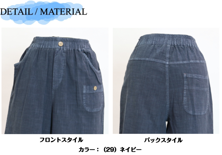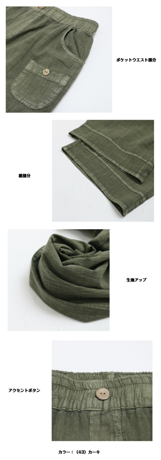 | デザイン | ウエスト総ゴム 前側ポケットあり(後ろ片側ポケット付き) 股下45cm |
