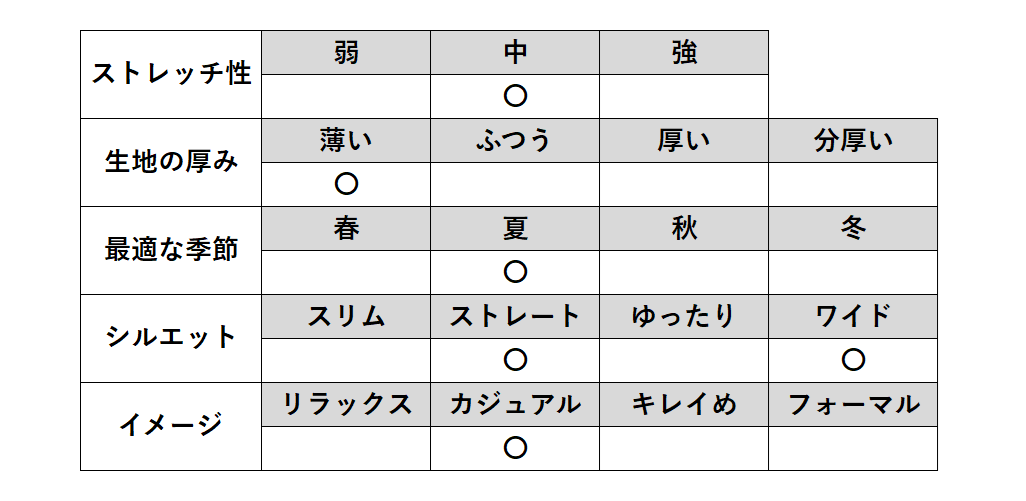 | 素材 | ナイロン41% 綿36% 麻17% ポリウレタン6% |